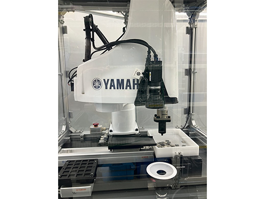 Asyril Asycubeとヤマハ発動機スカラロボットによる高速で柔軟なワーク供給システムです。バラ積み部品をAsycubeで最適に分布させた後、ビジョンシステムRCXiVY2+で認識、スカラロボットYK400XEでピック&プレイスを行います。